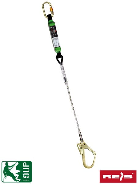 - Po jednej stronie liny pochłaniacz energii wyposażony w karabińczyk, po drugiej stronie stalowy hak oczkowy do rusztowań.